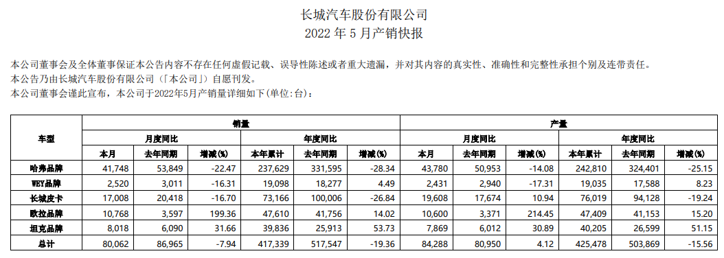 长城汽车6月8日晚间公告,5月销量总计80062台,同比下降7.94%;1-5月累计销量417339台,同比下降19.36%。5月产量84288台,同比增长4.12%;1-5月产量425478台,同比下降15.56%。5月海外销售12317台,1-5月累计销售49372台。5月新能源车销售11637台,1-5月累计销售50910台。哈弗品牌5月销量41748台,同比下降22.47%;欧拉品牌5月销量10768辆,同比增长199.36%。