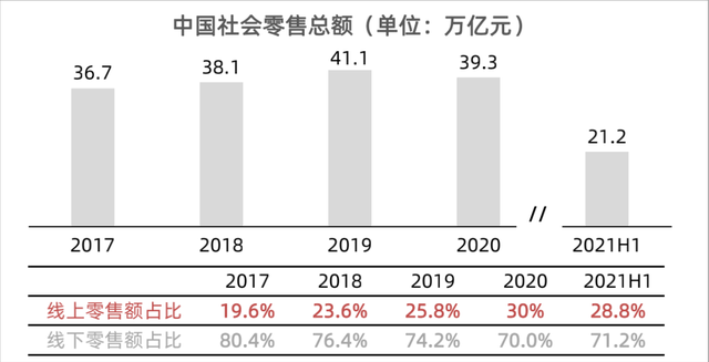 一守一攻背后,是中国庞大的零售市场份额不足30%的线上化率,所有人都在努力争取分到更多的蛋糕。
