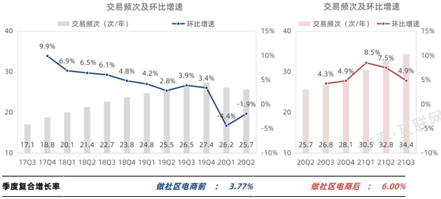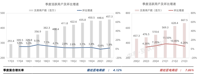 对比美团在做社区电商前与社区电商后的用户增长,季度的复合增长率呈现成倍增长的趋势。