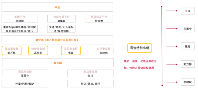 去年9月,美团正式将战略从“Food+Platform”升级为“零售+科技”,之后一个月,又进行了一次特别人事调整,由王兴、王莆中、李树斌、郭万怀、陈亮五人组成了零售特别小组,展示美团押注零售的野心。