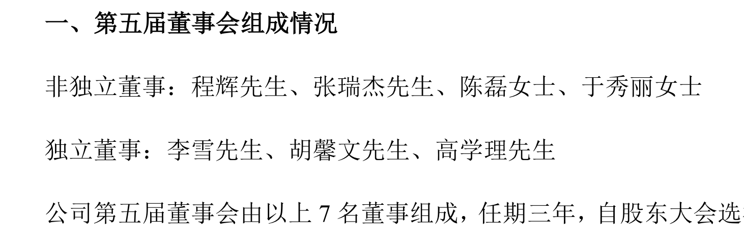 那么根据5月18日的投票结果来看,嘉兴傲晟的提名者,全部当选。不久后的5月23日,程辉被选举为新一届的董事长。