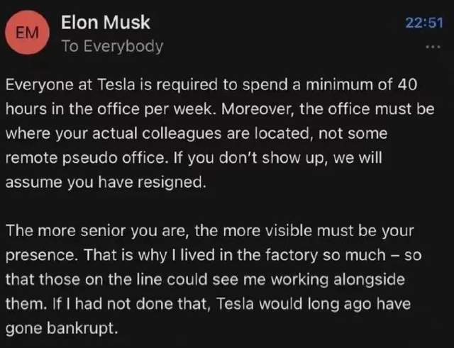 但规律也有反例。比如万亿市值的特斯拉毫无疑问是一家一流企业,但如今他们的CEO马斯克正在抓考勤。6月1日,马斯克通过内部邮件发布通知,要求员工尽快结束居家办公,回办公室上班,且每周必须在办公室待够40个小时。他的口气颇为严厉:“如果你不来,我们就认为你已经辞职了。”
