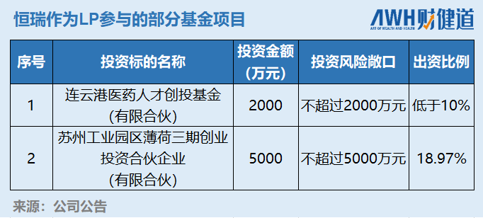此外,恒瑞医药还曾作为LP参与过连云港医药人才创投基金及苏州工业园区薄荷创投基金项目,不过从出资比例来看,恒瑞所占比重并不高。