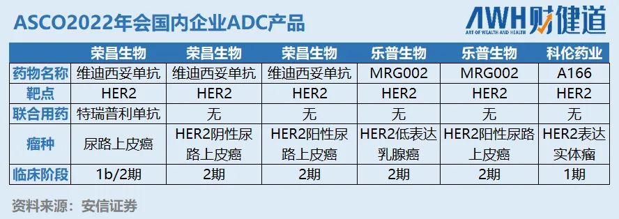 从本次ASCO年会国内企业报道的ADC产品来看,都聚焦在HER2领域,参与的企业有荣昌生物、乐普生物(2157.HK)、科伦药业(002422.SZ)等,主要报道的瘤种为尿路上皮癌与乳腺癌。