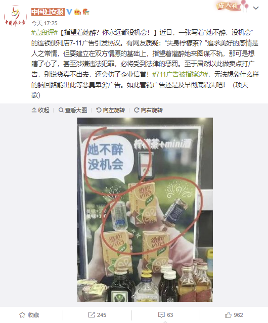 7-11广告“她不醉,没机会”引热议,中国妇女报评论:如此营销广告还是及早彻底消失吧