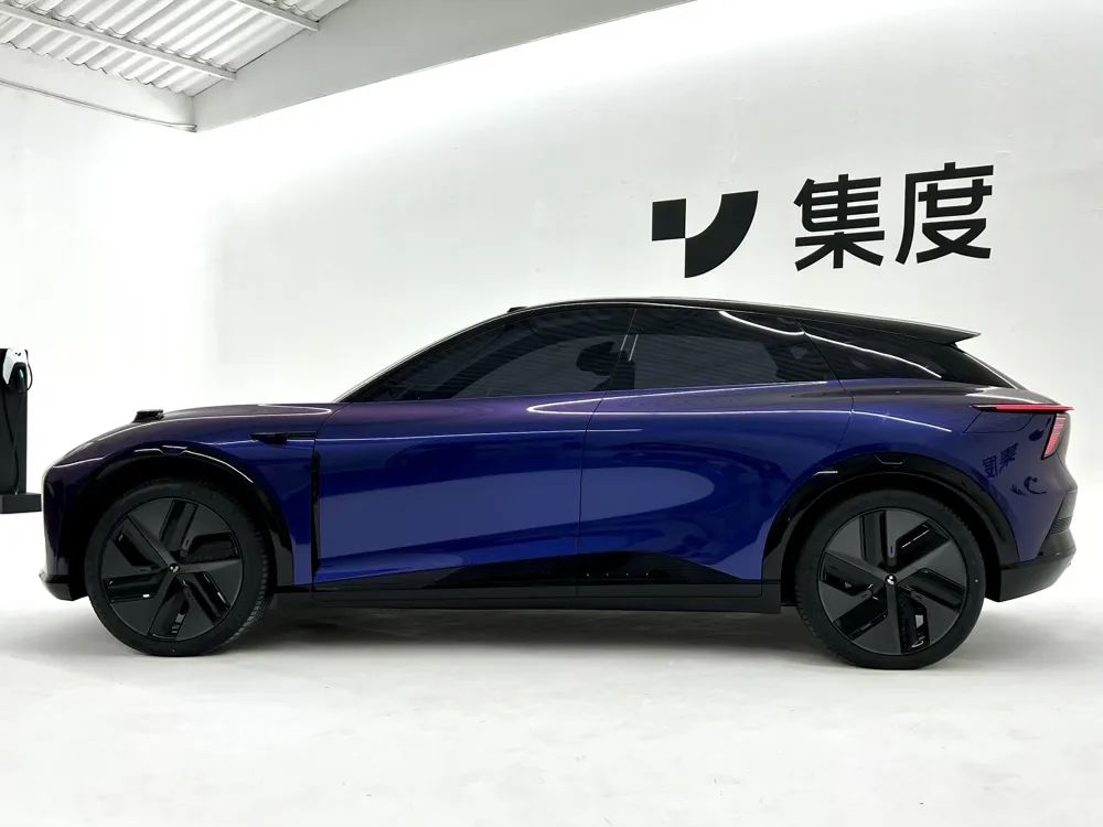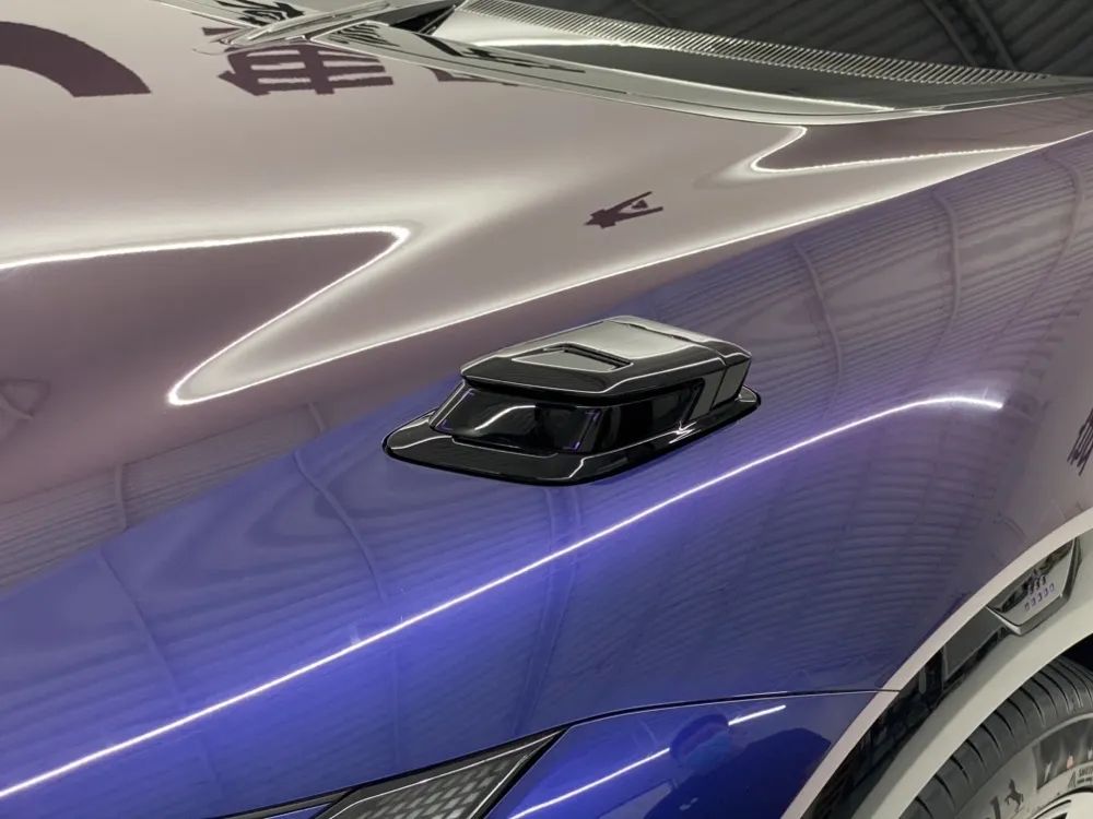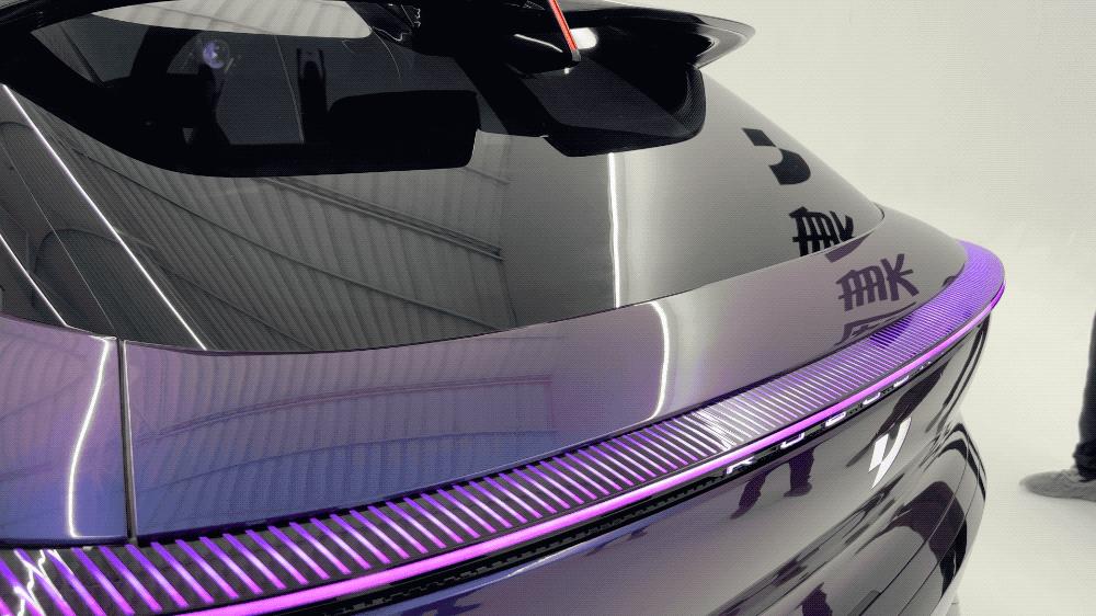 实拍车辆颜色为星河紫,车漆在不同角度光照下会呈现出从紫色到蓝色的渐变效果,再次彰显其科幻属性。