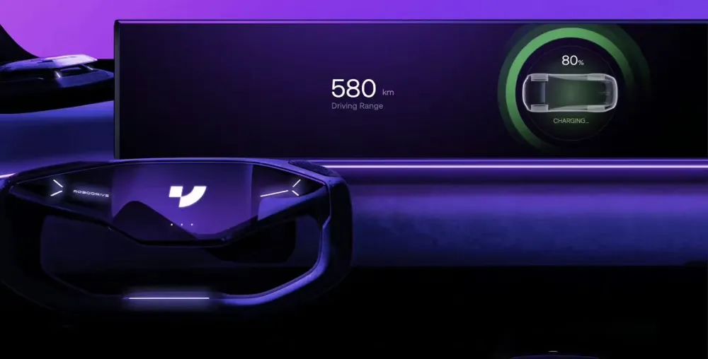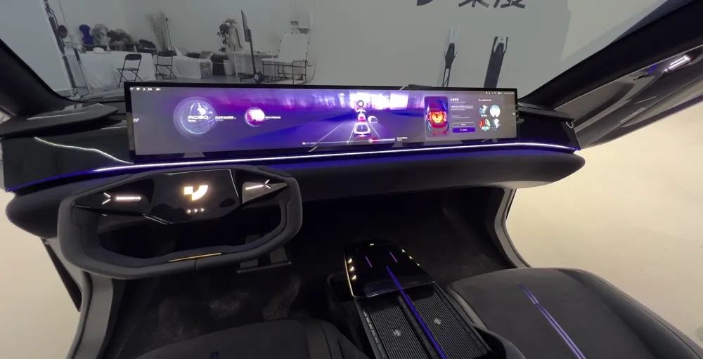ROBO-01的中控屏幕可以算是整个车内的一大亮点,采用了一整块从主驾位贯穿至副驾位的超宽“带鱼屏”,中间没有任何隔断,从左到右分别显示车辆仪表、导航信息以及副驾娱乐内容。