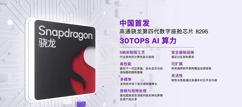 此前,在高通已经量产的第三代骁龙汽车数字座舱平台中,量产装车车型最多的是旗舰级芯片SA8155P(简称8155芯片),而8295芯片相比8155芯片在AI算力上提升了7.5倍。