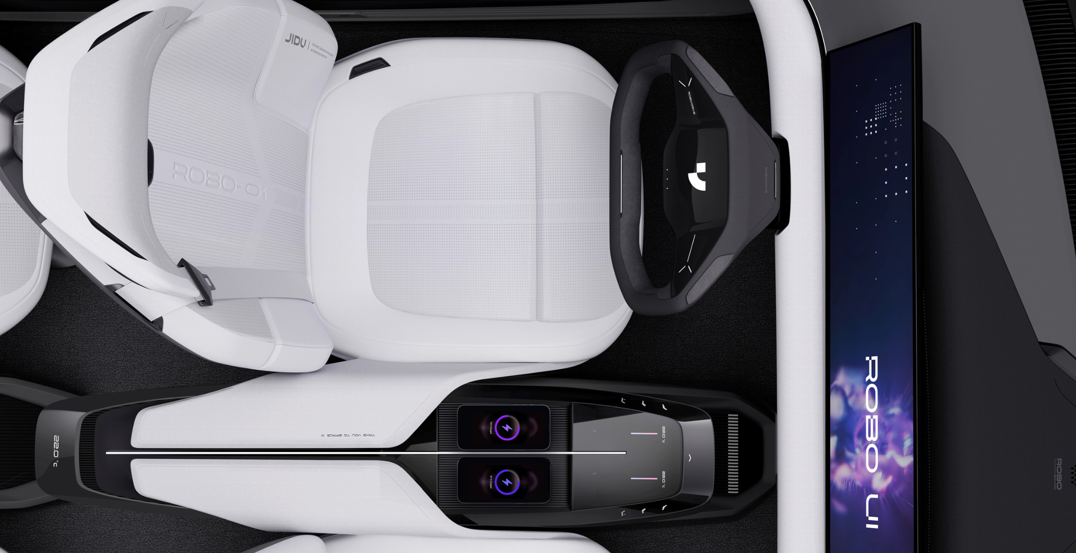 对于智能汽车格外重要的车机系统,ROBO-01选择了一块一体化超宽大屏,横向贯穿于主副驾驶两个座位。重点在于驾驶位展示了可折叠U型方向盘,即开启自动驾驶模式时,方向盘可收缩于车机屏幕之下,驾驶员可以得到暂时的解放。