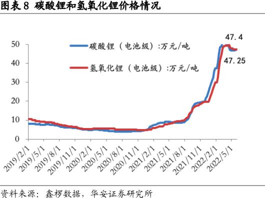 锂盐价格暴涨是锂电上游企业业绩爆发的主要原因。由于国内市场新增产能释放不及预期、上游锂辉石供应紧俏制约产量等因素影响,锂盐供给仍较为紧张。以电池级碳酸锂价格为例,该产品价格由2021年年初的5万元/吨左右涨至年末的20万元/吨左右后,进入2022年更是呈翻倍式增长,当前零售价已突破47万元/吨。