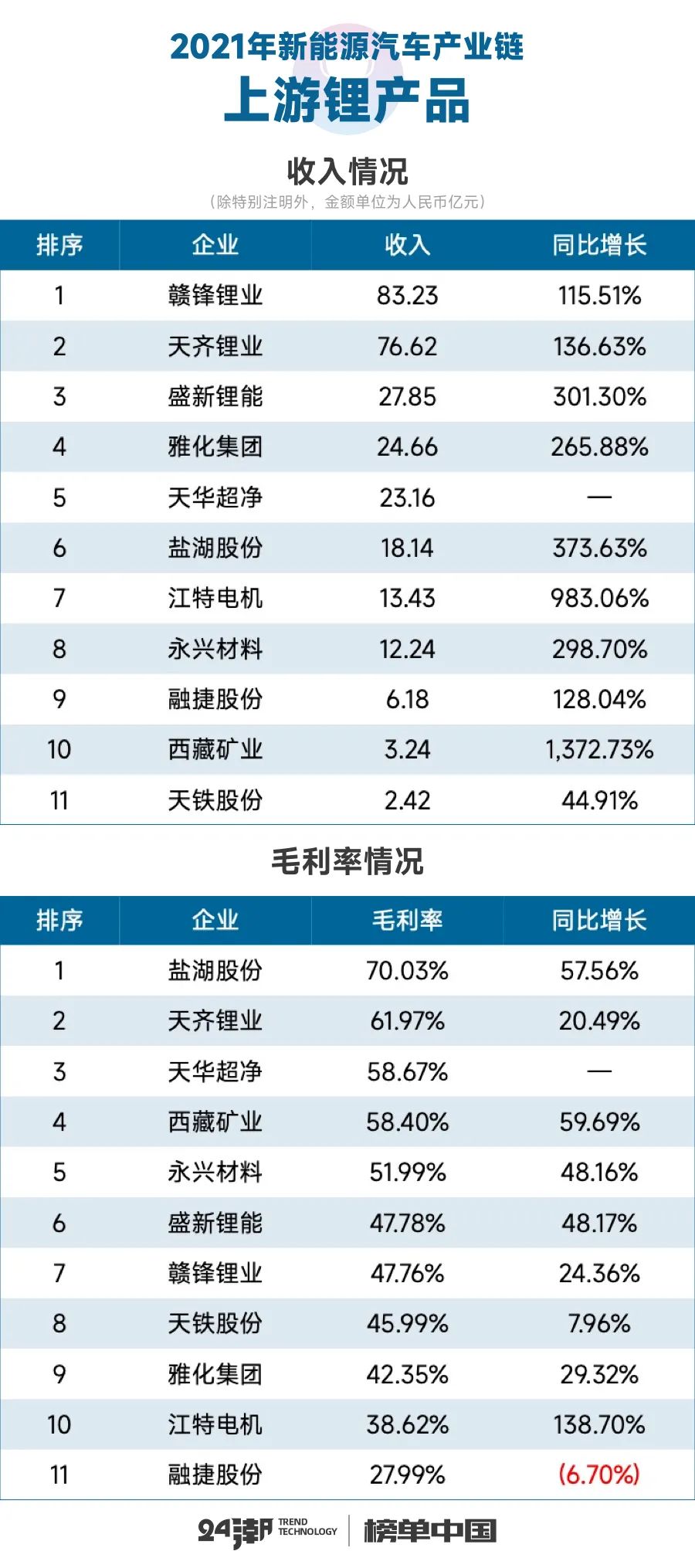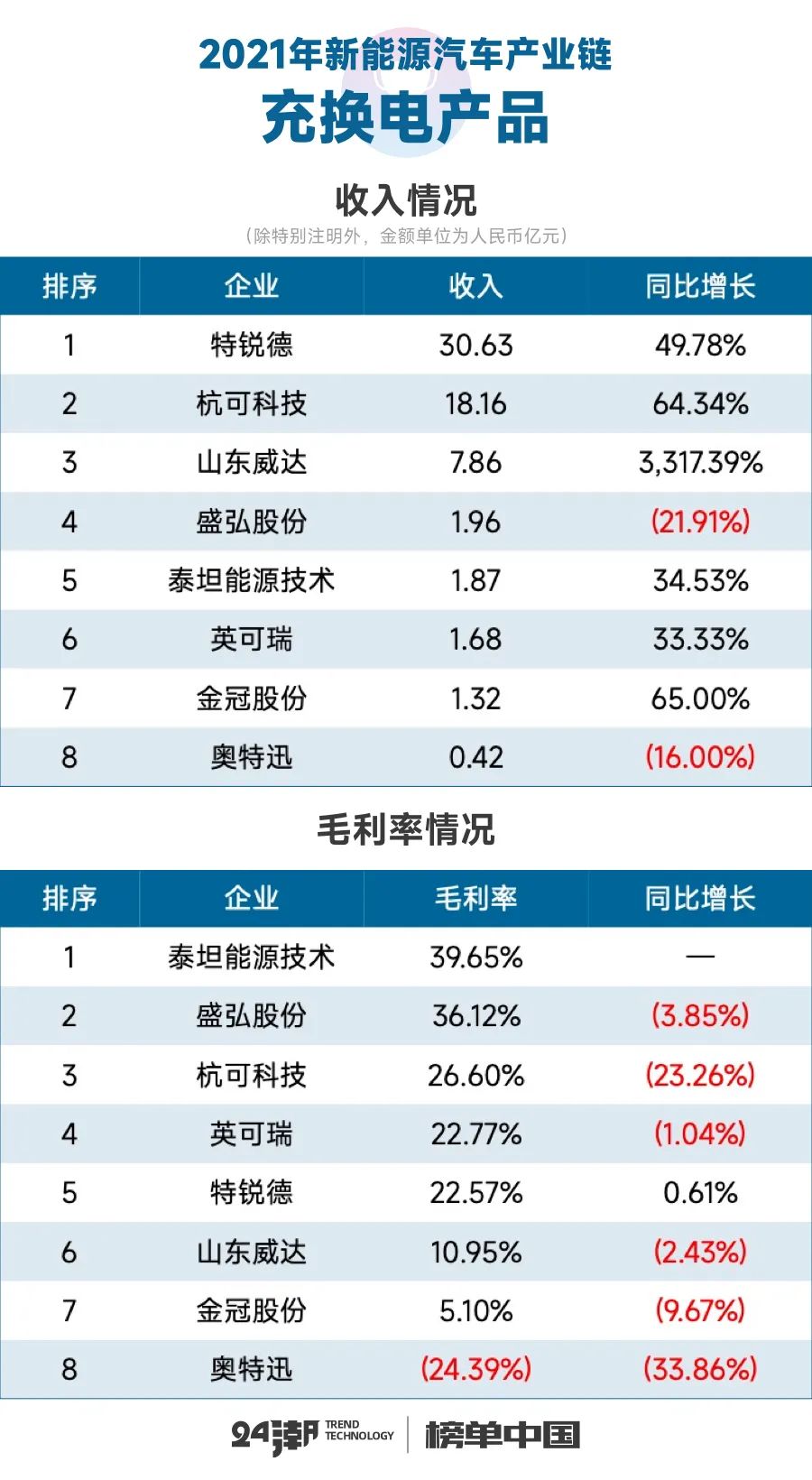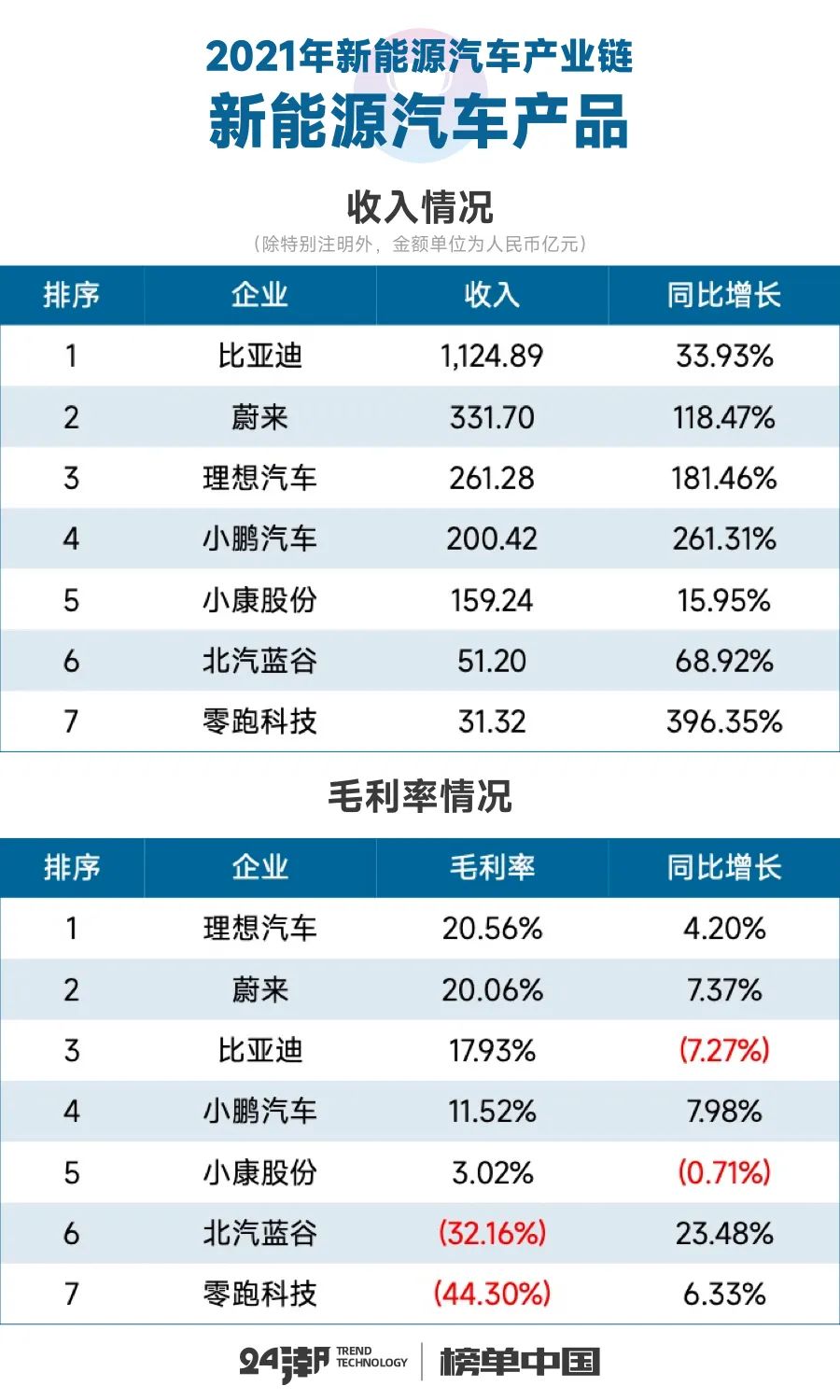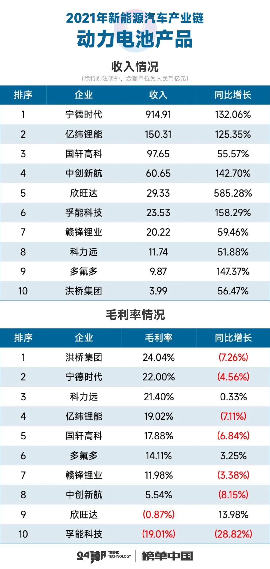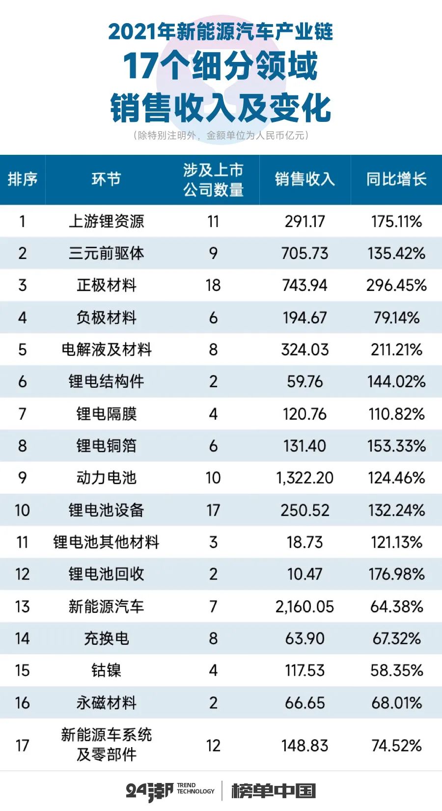 我们统计数据发现,2021年锂资源、正负极材料、动力电池、锂电池设备、新能源汽车、充换电等新能源汽车所有环节营收都实现了大幅增长,其中11个环节营收规模增长在100%以上!