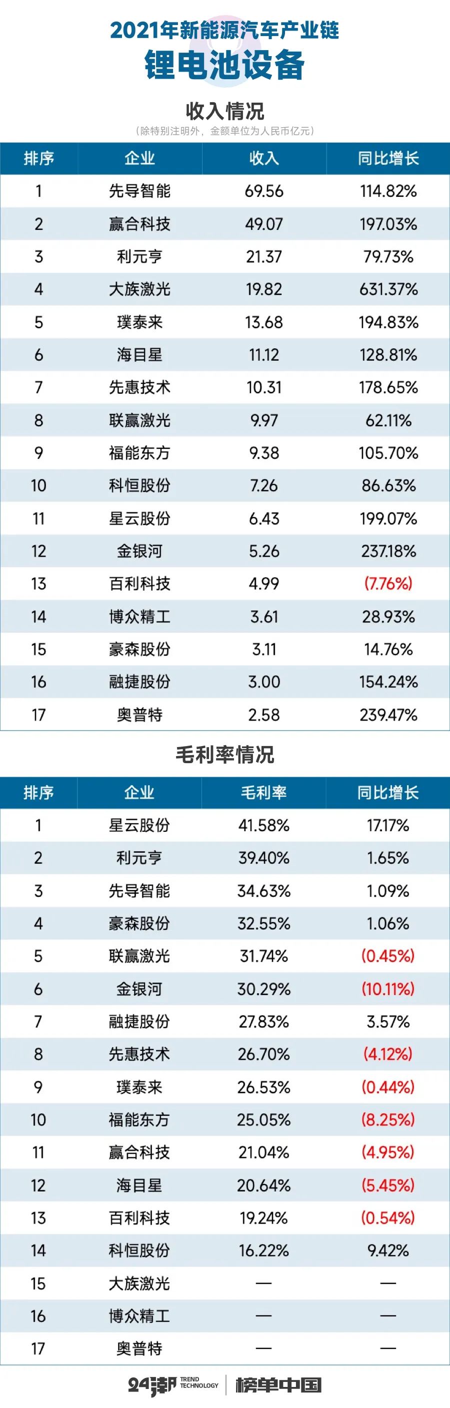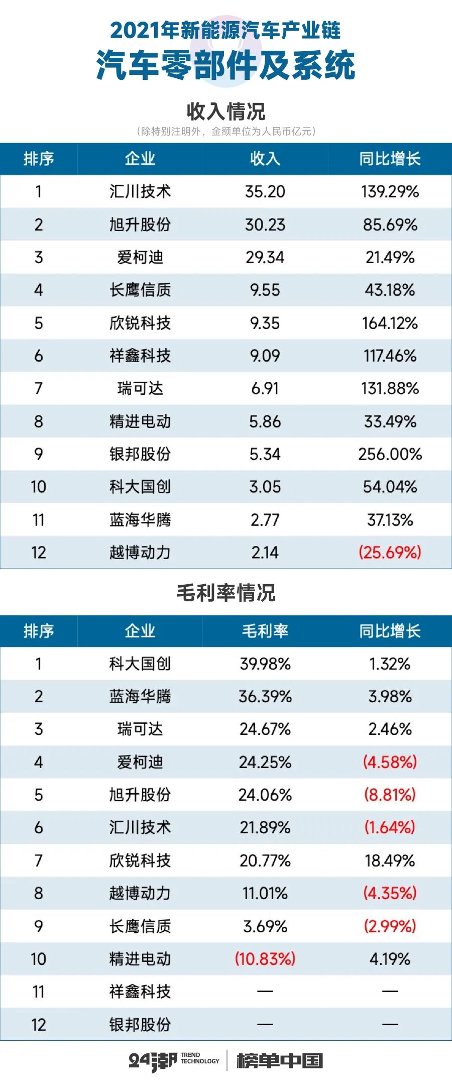 为了搞清楚这个问题,24潮研究团队梳理所有100多家新能源上市企业2021年在新能源汽车17个不同环节的业务营收及毛利率数据。
