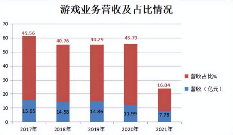 作为行业内腰部力量的昆仑万维,其实已经不算是一家完全意义上的游戏公司了。2017-2020年,其游戏收入为15.65亿元、14.58亿元、14.86亿元、11.99亿元,营收占比分别为45.56%、40.76%、40.29%、43.79%。在2021年则进一步萎缩,收入为7.78亿元,同比下滑超过35%,营收占比为16.04%。