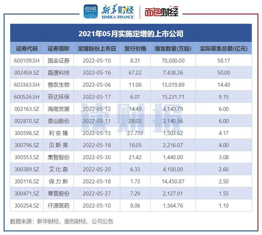 2022年5月实施定增的上市公司中,国金证券的实际募资总额排在首位。国金证券共发行约7亿股,发行价格为8.31元/股,实际募集资金总额约58.17亿元。发行对象包括成都交子金融控股集团有限公司、诺德基金管理有限公司、华夏基金管理有限公司等11家机构及个人投资者。其募集资金将全部用于增加公司资本金、补充营运资金及偿还债务,用于扩展资本中介及证券投资业务,以及向全资子公司资增。