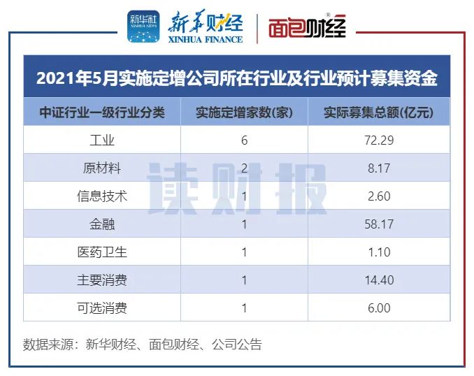 从行业分布来看,以中证行业统计,2022年5月,工业行业有6家上市公司实施定增,排在各行业之首;其次是原材料行业,有2家上市公司实施定增;其余行业均有1家公司实施定增。