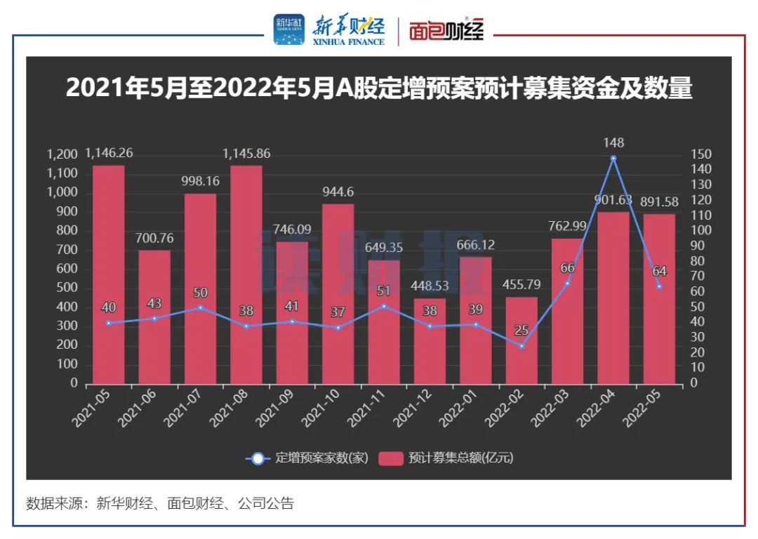 以首次披露预案公告日统计,2022年5月A股上市公司披露的定增预案(同一定增预案下的募资及配套募资合并统计,下同)共计64起,环比下降84起;预计募资规模合计约891.58亿元,与上月相比微降1.11%。