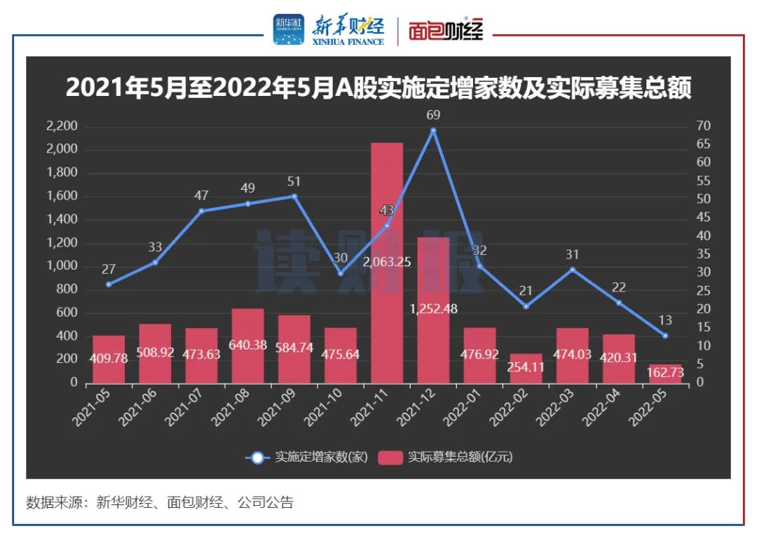 统计显示,2022年5月,A股上市公司共计实施定增13起,实际募资总额约162.73亿元,定增实施家数及实际募集资金较上月均有明显下降,较上年同期相比也有较大差距。
