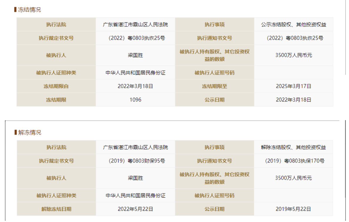 不久前的5月22日,梁国胜所持价值3500万元的股权解除司法冻结,执行案号为(2019)粤0803财保95号。