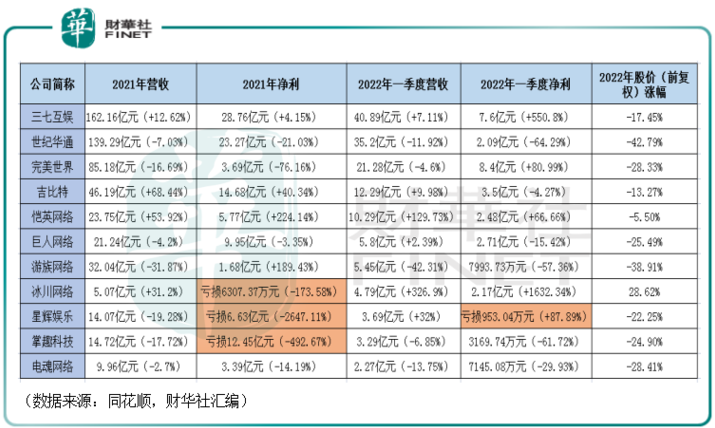 从2021年的业绩来看,实现盈利的公司还是占多数,只是增速相较于往年有所下滑。而在2022年一季度,游戏股的业绩表现有所回升,仅星辉娱乐出现亏损。