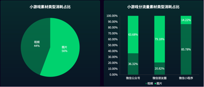 视频类素材虽然在消耗上不及图片素材,可是数量上却没有大幅落后,说明视频素材依然是小游戏传播中不可或缺的一环。