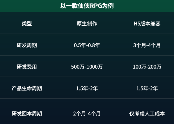 腾讯广告团队指出,一款原生制作的仙侠MMORPG小游戏整体研发周期大约需用时6-10个月,研发费用约为500W至1000W,投放的回本周期却只需2-4个月,而一款产品的生命周期最高可以长达2年。整体来看,原生制作的小游戏,研发周期和成本至少可以降至手游APP的50%。在相同的投放效果下,回本周期较短。