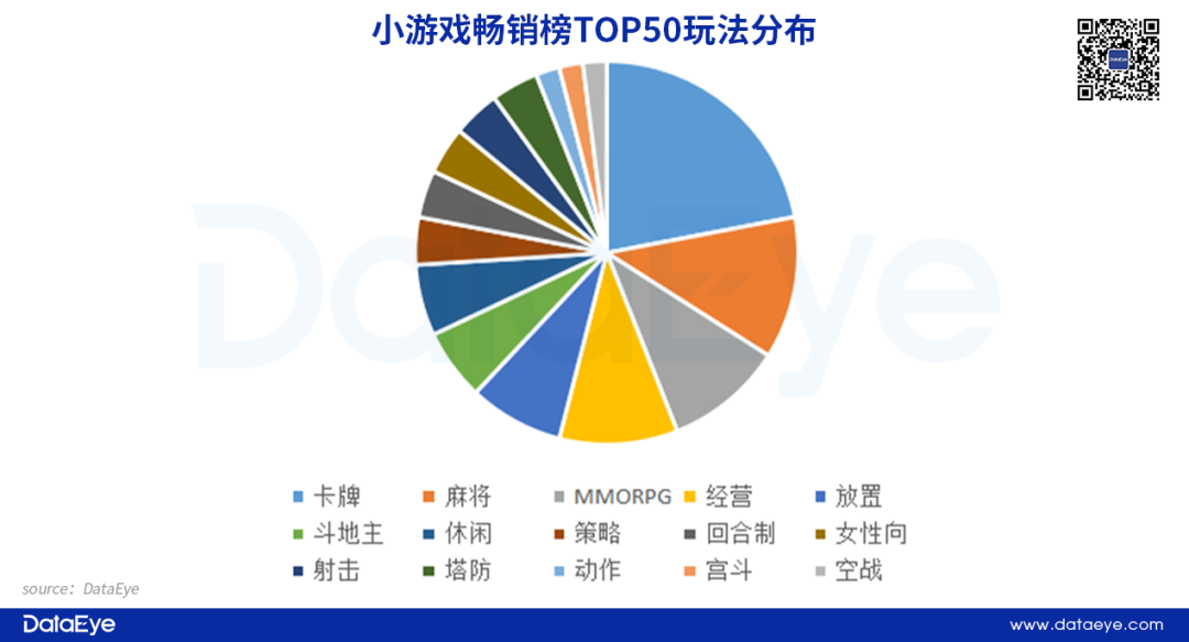 从游戏玩法来看:中重度玩法在小游戏端游市场较多。以DataEye-ADX小游戏玩法分类显示,目前卡牌玩法在吸金能力上表现出色,大盘占比超过20%,其代表就是目前排名畅销榜第一的《咸鱼之王》。此外,相对重度的MMORPG品类也排名第三,说明中重度玩法在小游戏端有着不错的市场占比,玩家乐意接受。可以发现,策略、动作玩法等产品也能进入畅销榜TOP50。