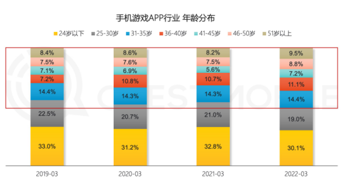 实际上,该数据与Questmobile2022年手游行业报告相仿。该报告指出,游戏市场用户年龄层占比也在发生变化,尤其是30岁以上的用户群体占比明显增多,游戏用户年轻化的大众印象正在发生改变。