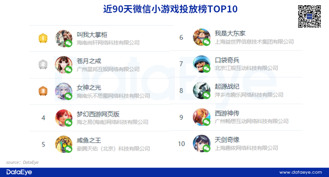 微信小游戏在营销阶段更多是依赖于买量广告。根据DataEye-ADX投放数据检查,近90天微信小游戏投放榜TOP10中,《叫我大掌柜》排名投放第一,投放力度强劲。网易、豪腾以及益世界等头部厂商均在列。