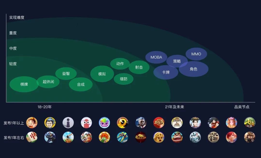 2019年以前:中轻度休闲游戏占据主导地位。在微信小游戏初期阶段,大多数小游戏以轻度休闲为主,例如棋牌、合成消除以及益智相关游戏类型。一是开发门槛不高,产品可以快速上线;二是因为大部分厂商并没有计划投入过多资金。在变现方式上,极大部分以IAA为主。