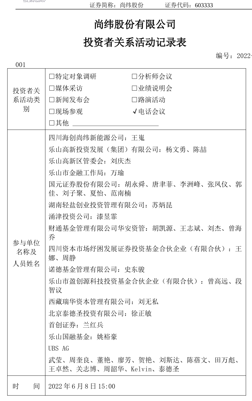 在此背景下,机构投资者也展开了对尚纬股份的调研。根据6月9日披露的投资者关系活动记录表来看,6月8日下午收盘后,有国元证券、首创证券、湖南轻盐创业投资管理有限公司、涌津投资公司、财通基金管理有限公司华安资管、诺德基金、乐山市盈创源科技投资基金合伙企业(有限合伙)、西藏瑞华资本管理有限公司、北京泰德圣投资有限公司、乐山国融基金、UBS AG等与上市公司进行了电话会议,与会的还有四川资本市场纾困发展证券投资基金合伙企业(有限合伙)、乐山市金融工作局、乐山高新区管委会、乐山高新投资发展(集团)有限公司,以及四川海创尚纬新能源公司(下称海创尚纬)的代表。