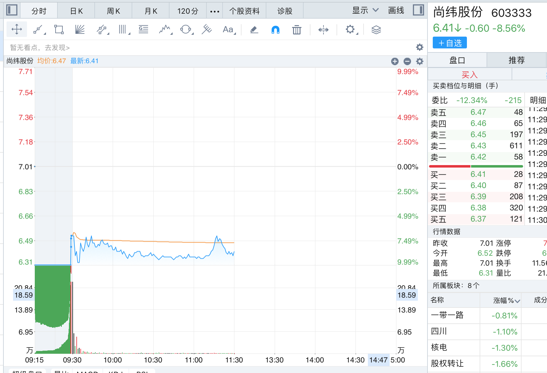 6月9日,尚纬股份并未像前两日般“一字跌停”,虽也是低开,但始终未有封板,6月9日午时收盘,尚纬股份的跌幅为8.56%。