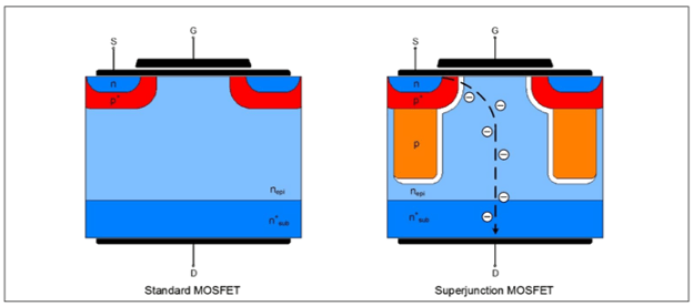 这些器件类似于功率 MOSFET。最大的区别在于,超结功率MOSFET在结构内由垂直的高纵横比P/N柱组成,具有一些优势。