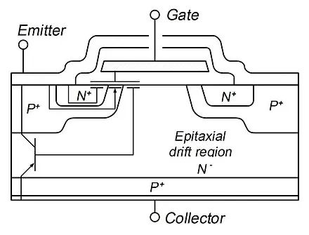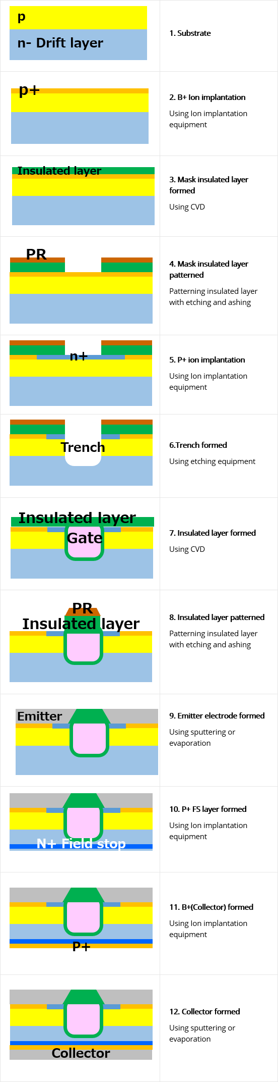 与功率 MOSFET 一样,IGBT 由平面或沟槽栅极结构组成。在更先进的基于沟槽的 IGBT 中,该工艺首先在衬底上沉积四个交替外延层(PNPN)。