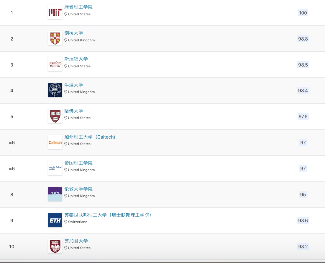 全球范围内,麻省理工学院连续第11年位居榜首,剑桥大学上升至第二名,斯坦福大学第三名。榜单前十名中,美国、英国、瑞士高校数分别为5所、4所、1所。