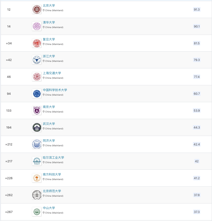 清北之外,跻身前300名的大陆高校还有:复旦大学、浙江大学、上海交通大学、中国科学技术大学、南京大学、武汉大学、同济大学等,大部分院校排名均同比有所上升。