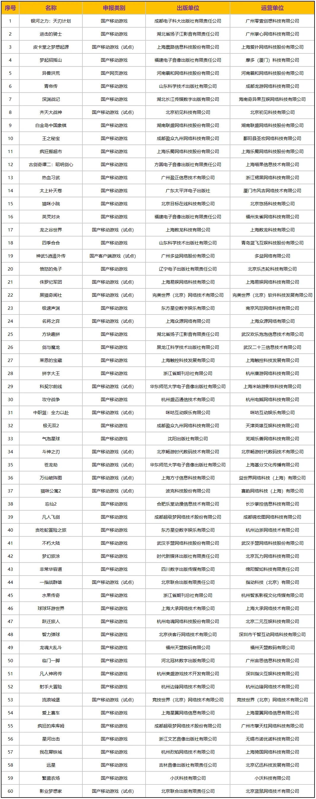 除此之外,还有完美世界《黑猫奇闻社》、益世界《万仙破阵图》、IGG《龙魂大乱斗》等游戏获得版号,以下为60款完整版号名单:
