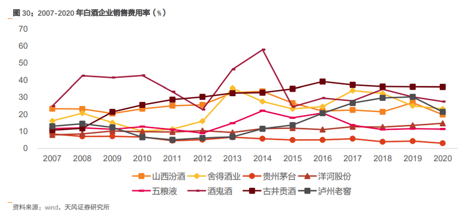 目前,在白酒诸强中,老大茅台和老二五粮液的销售费用率都不高,其中茅台最为明显。这一现象背后,是行业前二品牌溢价能力的体现。