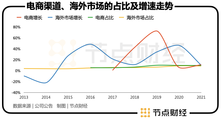 说电商(包括天猫、京东等渠道)是重中之重的原因在于,相比海外市场,洽洽食品的电商渠道不仅开辟时间晚,营收占比也进入了下行区间。因此,理论上电商还有更大的提升空间。