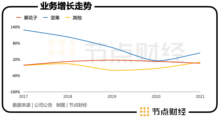 坚果业务与瓜子业务面临相似的问题。坚果业务已经陷入了增长困境。在2017年之后的几年里,坚果业务的增速只在2021年实现了同比上涨,从2020年的15.14%反弹至43.82%,其余时间都在下滑。
