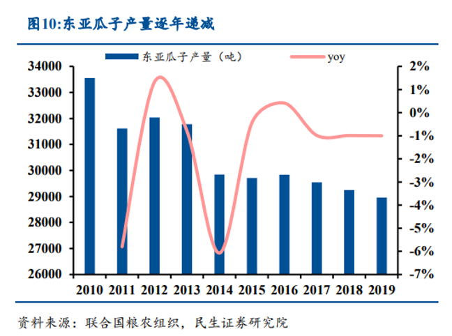 此外,东亚地区瓜子产量从2015年起进入下行期,维持在3万吨以下,这也能从侧面印证了中国瓜子人均消费量遇到瓶颈。