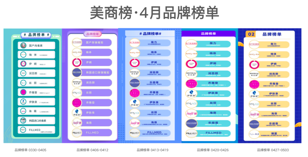 到五一小长假还有个变化,由科医国际贸易(上海)有限公司代理的瑞蓝进入榜单,珈溪(北京)生物科技有限公司代理的FILLMED跌出榜单。