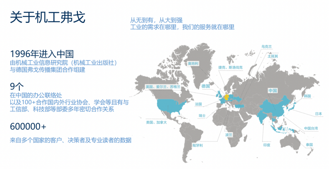 机工弗戈传媒由机械工业信息研究院(机械工业出版社)与德国弗戈传播集团于1996年合作组建。旗下有诸多子刊,包括AI汽车制造业、pharmTec制药网、MM金属加工、流程与工业、实验与分析、MM物流网、自动化与驱动网等等。美通社与机工弗戈传媒的合作,将涉及内容授权、渠道发布、传播整合等多方面。基于双方十余年友好的伙伴关系和信任度,美通社将把八大B2B行业的实时资讯内容,分发到机工弗戈传媒集团系列子刊的相关内容频道。
