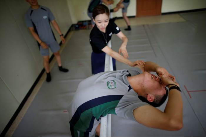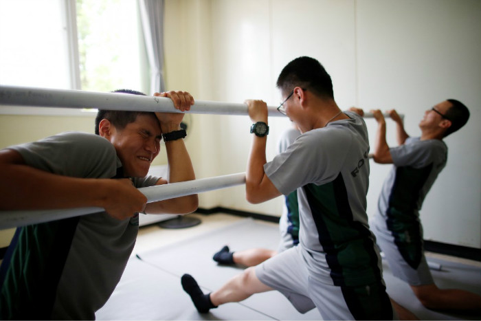授课老师来自韩国国家芭蕾舞团,每周造访一次这个军营。她会训练这些士兵的柔韧性,尽管一次下蹲就让他们感到痛苦不已。↓