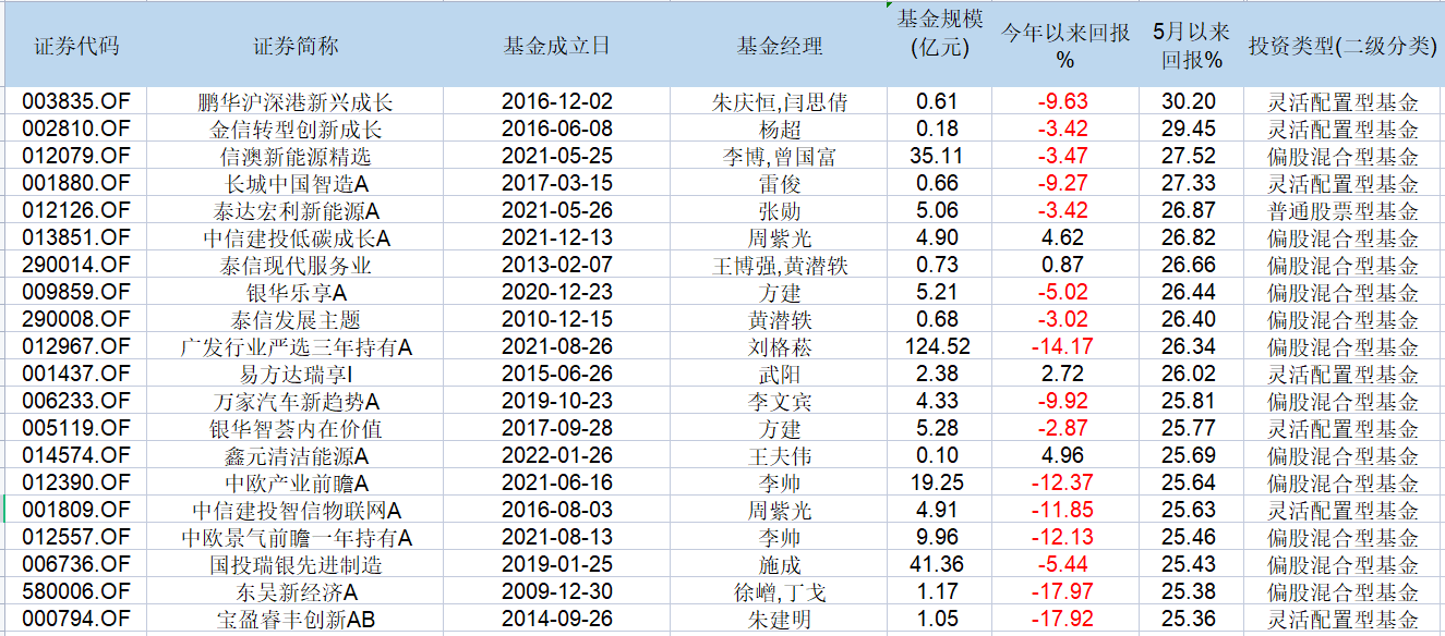 Wind数据显示,自5月份以来,全市场共有398只涨幅超20%(A/C份额合并计算),其中277只主动权益类基金(偏股、灵活、普通)涨幅超20%。