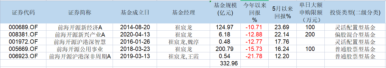 5月份以来,崔宸龙管理的几只基金净值大幅翻红。6月6日,前海开源新经济的当日净值涨幅为4.6%,4月27日的净值涨幅高达8.31%。不过,值得注意的是,虽然最近净值涨幅较大,但从今年以来的业绩来看,几只基金的回报率仍为负数,尚未从深坑里爬出来。