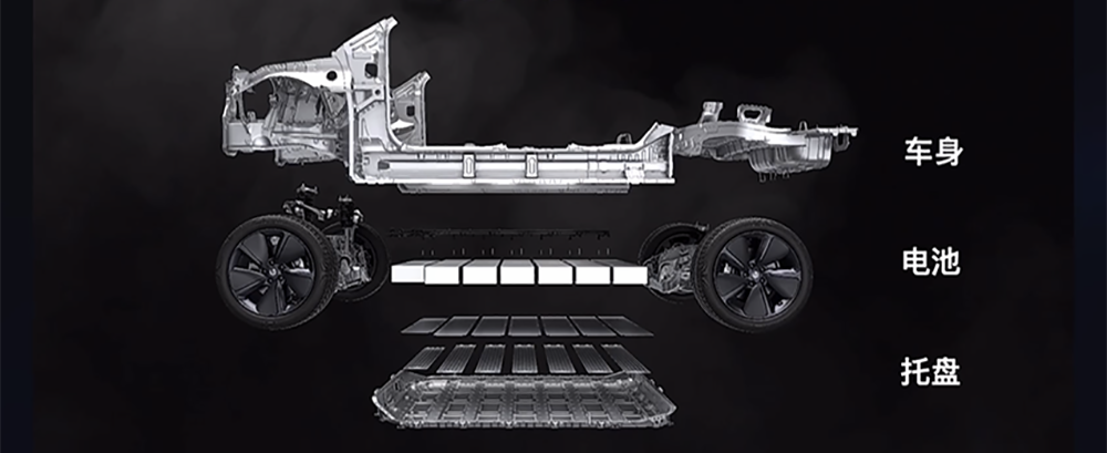 具体来看,车企直接取消了电池包的上板结构,或者说将车辆内底板作为电池组的上板结构,然后将电芯布置在托盘上,将托盘和车身内底板组合在一起,形成新的车身结构。