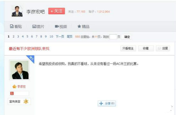 在百度贴吧的“李彦宏吧”里,一位ID名为“李彦宏”的用户发布了“最近有不少欧洲球队来找”的主题帖子,该用户在帖子里称,“希望我投资或收购,我真的不看球,从来没有看过一场AC米兰的比赛。”一位百度内部人士向新浪科技透露,该ID确实为百度董事长李彦宏所有。