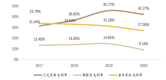 仅就赤藓糖醇而言,三元生物的毛利率要显著领先于保龄宝和金禾实业。