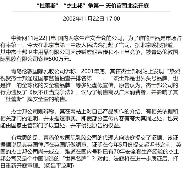 市场有了,胆子就更大了。杰士邦的宣传文案上开始出现“世界头号品牌”“唯一的全球化安全套品牌”等字眼。虽然这时候杰士邦已经着手成立杰士邦(英国)全球有限公司,并将武汉这一根据地变为杰士邦品牌在中国的总经销商。但杜蕾斯却抓住了这一宣传漏洞,以涉嫌虚假宣传与不正当竞争为由,将杰士邦告上了法庭,并索赔500万。