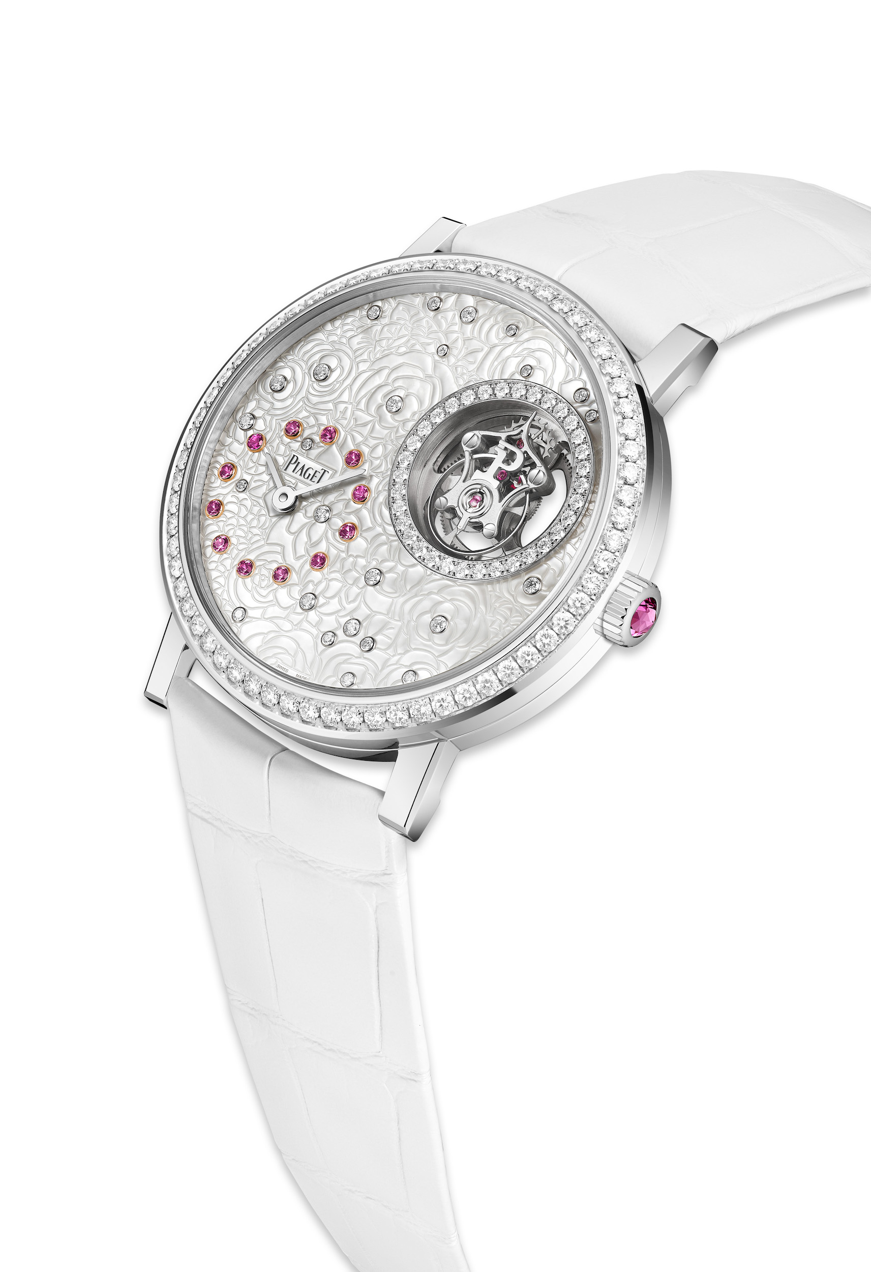 PIAGET伯爵Rose系列全新推出一款时计作品,选取玫瑰元素,致敬伯爵家族传人Yves Piaget。这款腕表采用18K白金打造,以精致华美的花卉雕饰,诠释惊艳创意与巧妙设计。工匠大师选用真正的玫瑰花瓣来打造表带,并历经两年多,将这条极具创意的玫瑰表带最终呈现。表盘直径38毫米,搭载伯爵自制超薄手动上链机械670P飞行陀飞轮机芯,动力储存48小时。表圈镶饰64颗明亮式切割美钻、表冠镶1颗明亮式切割粉色蓝宝石、珍珠母贝雕花表盘,镶饰5 颗明亮式切割美钻。表达出华美经典,又具有时尚品味的美学理念。